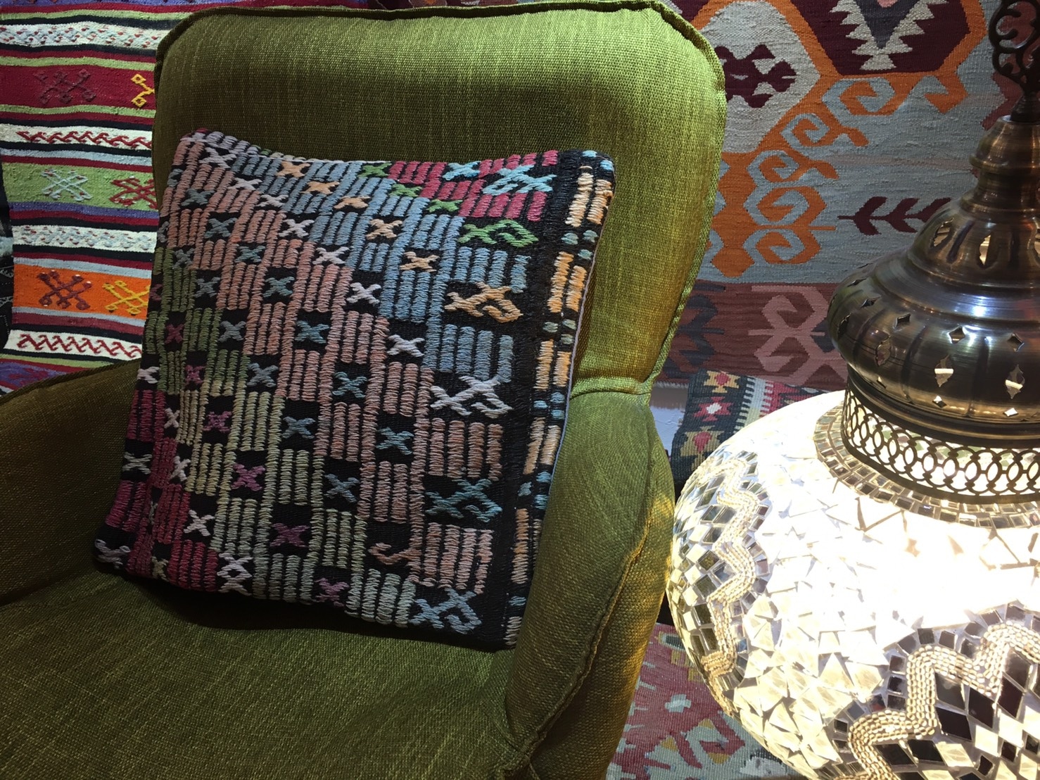 10色の糸をふんだんに使ったキリムカバー。特に幸せの色であるトルコブルー。お守りの色である赤。この2色が刺繍で織り込まれており素敵で可愛らしい一品です。
